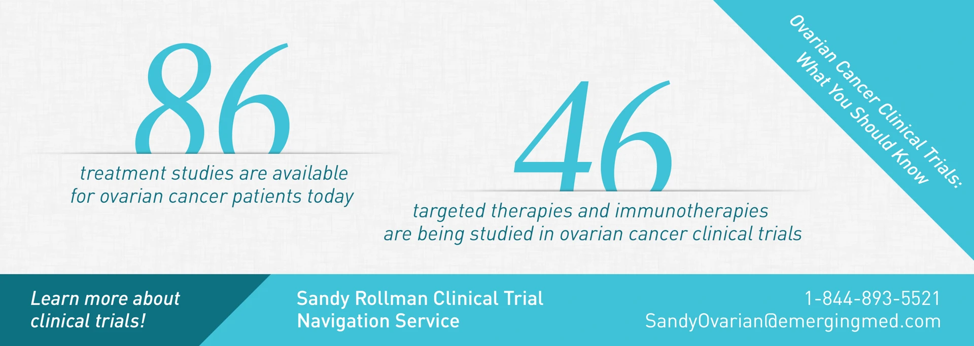 We encourage you to call 844-893-5521 to find clinical trials that match your situation and to learn more about cancer research. Our clinical trial navigators are available Monday through Friday from 9am to 6pm ET or email: SandyOvarian@emergingmed.com
